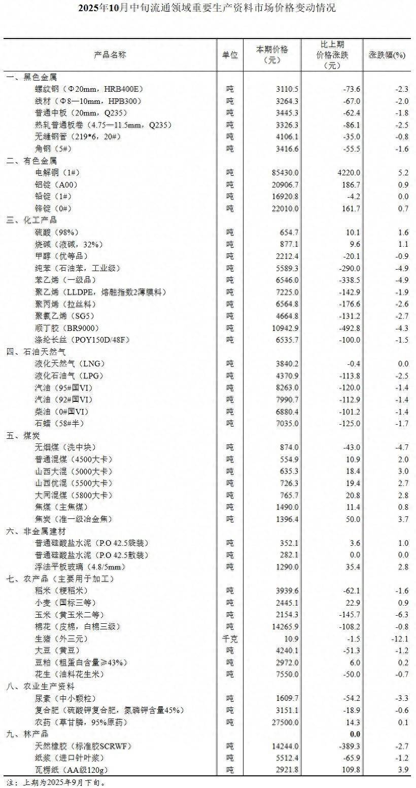 智通财经APP获悉水果优配,国家统计局发布10月中旬流通领域重要生产资料市场价格变动情况。据对全国流通领域9大类50种重要生产资料市场价格的监测显示,2025年10月中旬与9月下旬相比,17种产品价格上涨,30种下降,3种持平。其中生猪(外三元)价格环比下降12.1%。