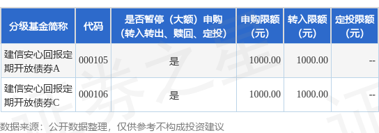 本站消息,11月5日建信基金管理有限责任公司发布《建信安心回报定期开放债券型证券投资基金基金暂停大额申购、大额转换转入公告》。公告中提示博泰配资,为保护投资者利益,自2025年11月7日起建信安心回报定期开放债券型证券投资基金基金暂停大额申购、大额转换转入,申购、转换转入上限金额为0.1万元,下属分级基金调整明细如下: