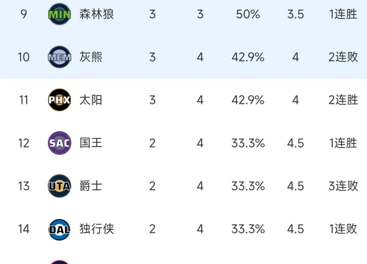 除了上述8支球队之外,排名第9至15的分别为,森林狼,灰熊,太阳,国王,爵士,独行侠,鹈鹕,整体来看,鹈鹕已经准备争夺状元了,目前还没有取得一场胜利。而独行侠今年的表现,实在太过于令人意外,休赛期的信心有多强?现实就有多残酷,难道一个状元不够,他们要凑齐4个状元吗?